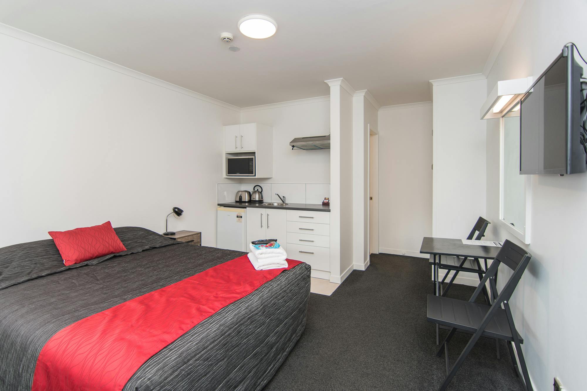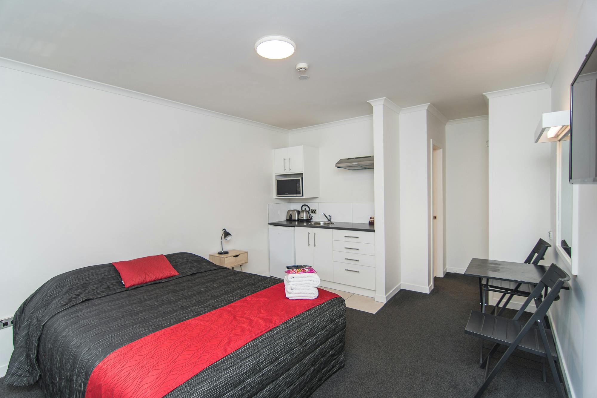 Perfect for couples or a single person, the studio comes with one queen bed, a basic kitchenette, a wardrobe, as well as a full ensuite bathroom boasting a shower with amazing heat and pressure plus a hairdryer and iron are supplied.